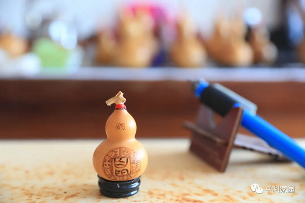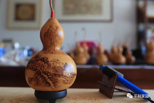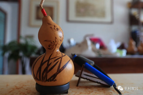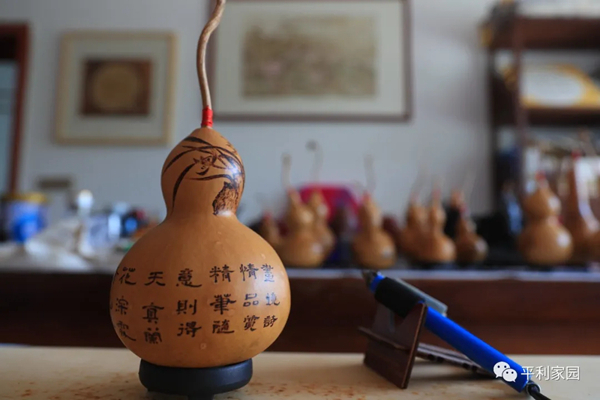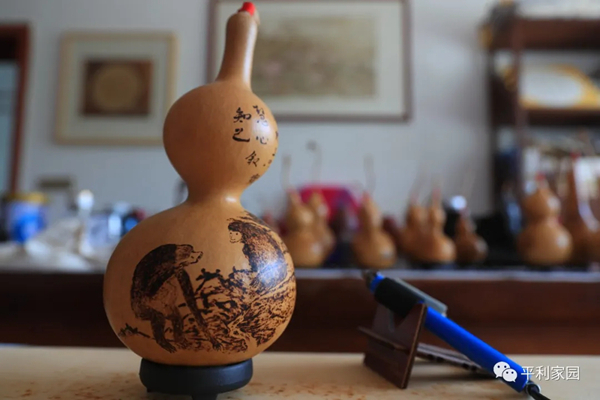 一組葫蘆,明黃里透出古色,熠熠生輝的畫幅里,平利雄山秀水滴滴溢出,一時(shí)間,香氣四溢,鄉(xiāng)風(fēng)彌漫,整個(gè)房間便裝滿女媧故里平利的山山壑壑。