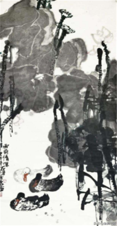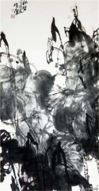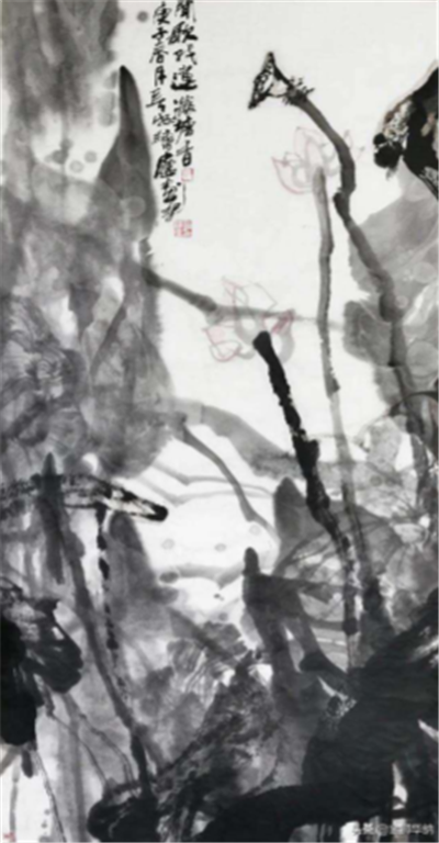 其中,《風(fēng)搖荷花聽雨聲》這幅國畫作品令我記憶尤深,畫面尺寸為 180×96 厘米,整幅畫采用寫意手法,虛實相生,荷葉由近及遠,由實到虛,畫面色調(diào)以黑白為主,簡約又包容萬物,墨色濃淡有致,筆法干脆利落,含蓄中帶著一股蓄勢待發(fā)的張力,構(gòu)圖飽滿,幾片荷葉占據(jù)了畫面的主要部分,在荷葉群中不時穿插幾朵荷花、蓮藕,荷葉的輪廓從前至后,由清晰至模糊,營造了一種水汽氤氳感,荷花隨風(fēng)擺動,遠處的荷葉似乎和水面渾然融為一體的畫面,荷花與水色天光互為襯托,靈動生機,畫家將荷花人格化,以荷言志,贊賞荷花在雨中傲然挺立的高潔風(fēng)骨,憐惜荷花飽受風(fēng)雨的摧殘,以此為畫面精神支點,物我合一,從自然界植物的角度感受世間百態(tài),看著這幅畫,仿佛置身煙雨迷離,以游人眼光靜靜觀賞荷花搖曳之姿,在水墨流動中,體味傳統(tǒng)審美意象之氣脈,感受荷花的“出淤泥而不染,濯清漣而不妖”的淡泊雅致……
