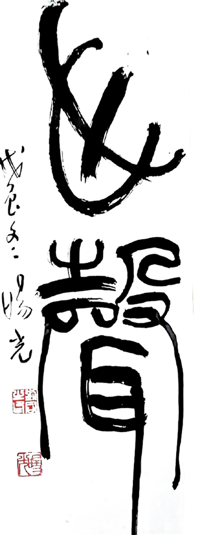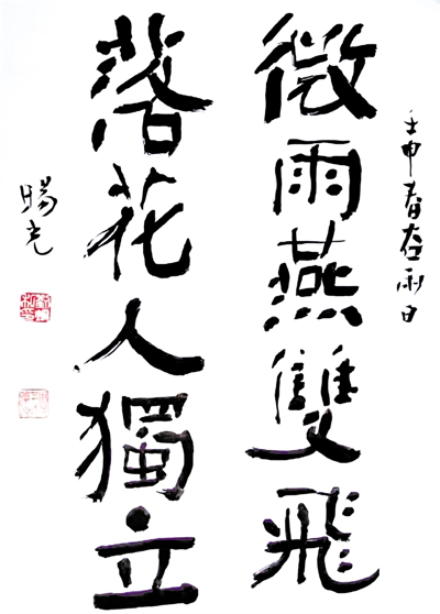 旸光先生淵博的家學(xué),深厚的學(xué)養(yǎng)為其書法技藝開掘出流淌不盡的源泉,正是他那非凡的經(jīng)歷與盤踞胸中的郁勃之氣,鑄就了別具一格的藝術(shù)風(fēng)采?v觀先生書法字里行間的布局、結(jié)構(gòu)、章法,即可以領(lǐng)略其高深的藝術(shù)修養(yǎng)。一般書法家給自己作品題款尚膽怯,更何況給山水畫人物、花鳥畫題款署名,書寫跋語,要求書者不但有深厚的文學(xué)功底賦詞作詩,再根據(jù)畫面的風(fēng)格,畫中所留空白虛實照應(yīng),用筆用墨的變化去應(yīng)對,好的款跋使作品升華。而先生無論行、草、隸、篆,縱橫涂抹,信手拈來如行云流水,宛若天成,令人折服,先生曾為不少后學(xué)作品撰寫款名,跋語至今記憶猶新。