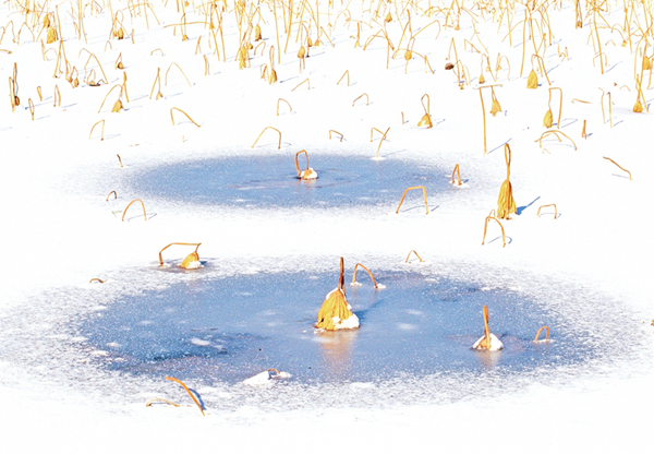 我的攝影創(chuàng)作圍繞生命的痕跡、時(shí)間的隱喻兩個(gè)主題。在《嘉實(shí)擷芳·野圃瑤音》中,菜園的微觀生態(tài)被賦予交響樂般的節(jié)奏——葫蘆藤的螺旋曲線是生命的律動(dòng),西紅柿根莖的垂直排列是生長的秩序,蚜蟲蝕痕的細(xì)節(jié)則暗喻生態(tài)的共生與抗?fàn)。而在《澄漪棹?middot;沙月溯光》里,榮成海岸的冬夏對比成為時(shí)間的隱喻,結(jié)冰湖面上的凋敗蓮蓬是流逝凝固的時(shí)光,夏日海邊的金色水洼則是流動(dòng)的永恒。我癡迷于捕捉這種矛盾與共生——就像用冷暖色調(diào)碰撞出畫面的張力,也用虛實(shí)構(gòu)圖處理每一張照片,期待每一張照片是個(gè)性鮮明,讓人耳目一新。