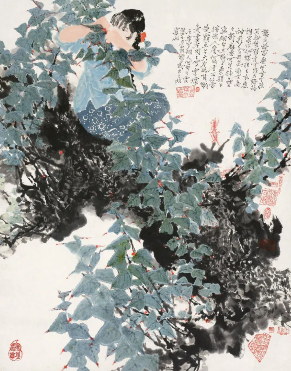 題識:蠶女齡喬桑,昔有王孫笑粉妝。羅素有情天降福,誰家不秘王祖。衣無神采食無魚,永世商裔掛麻桑。可笑棉蟲無飛翅,白女敢上桑顛上。俯視人寰何所有,不似當(dāng)(年)楚霸王。上天有路唯蛾素,畫者因之寫云。石魯寫朝天河畔之云婆,小名安蛾,為女之姑家也!恫缮D》,2010春拍成交價1064萬元。