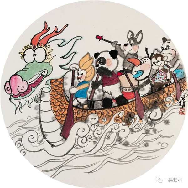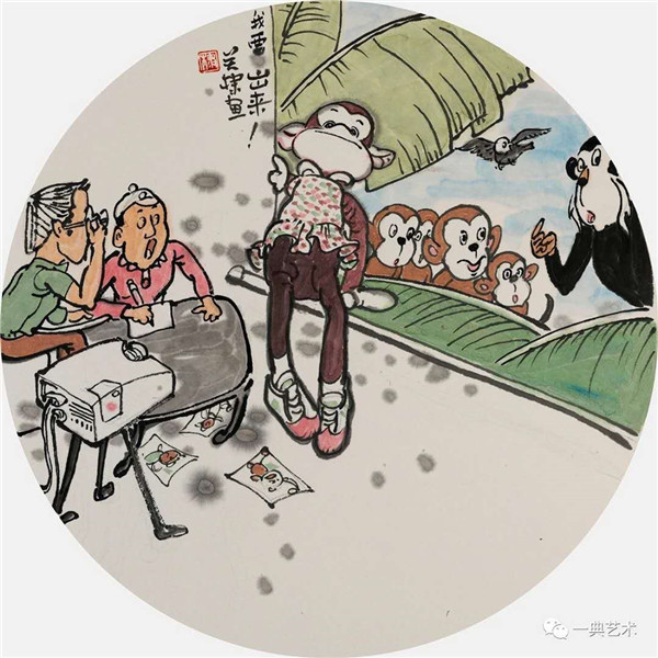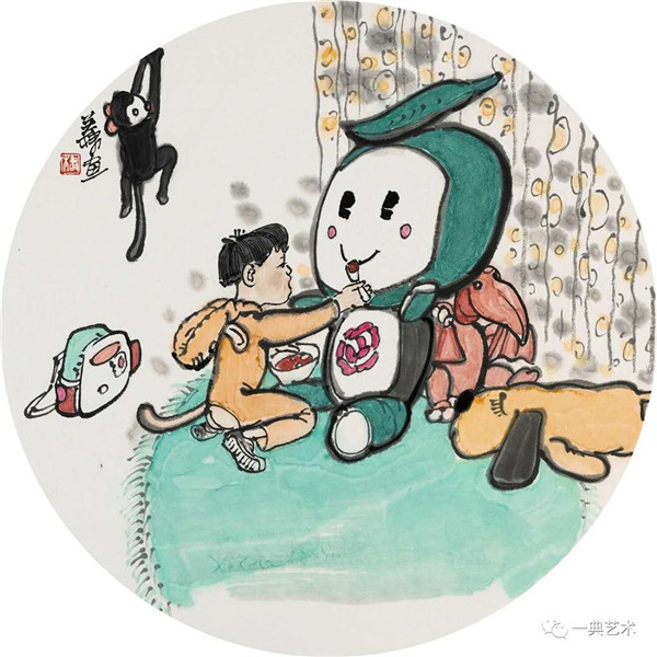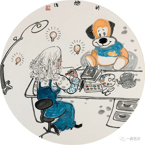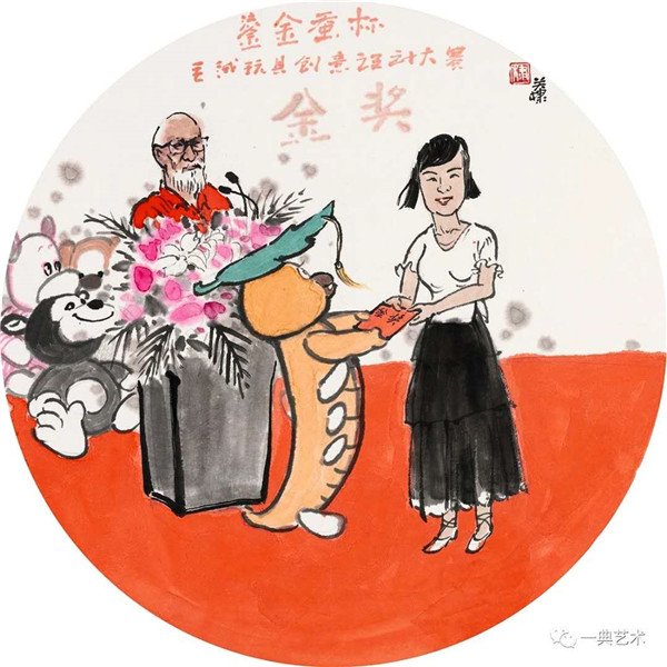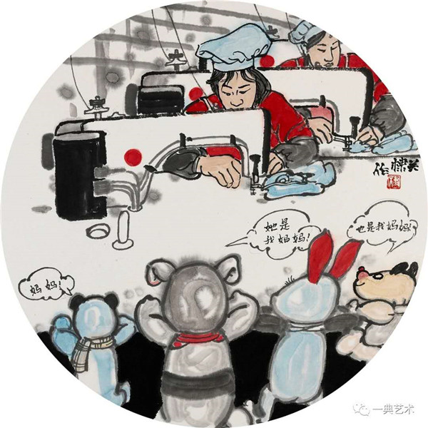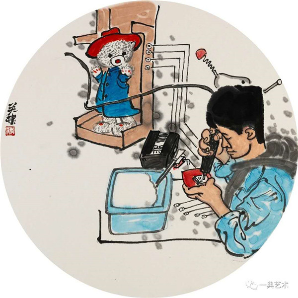 創(chuàng)作這個題材,我思考的內(nèi)容是豐富的,表達(dá)方式是明晰的,創(chuàng)作沖動是豐沛的。在初期,當(dāng)沒有門徑的時候,曾經(jīng)請人社局根據(jù)文字資料“劃重點”,而人社局領(lǐng)導(dǎo)給了很寬泛的態(tài)度:沒有重點,只要和毛絨玩具相關(guān)。這一態(tài)度實際上解放了我的思想,放開了我的手腳:尋求有約束的自由——給以充分自由——自我追尋“有約束”的自由。好吧,自己給自己尋找方向!考察結(jié)束,創(chuàng)作方向已經(jīng)確定:以人和毛絨玩具作為主要表現(xiàn)內(nèi)容,以中國水(彩)墨畫為形式。在那幾天(直至今日)我頭腦里充斥著毛絨玩具和女工的形象,兩者形異神同,就像《西游記》中人神共處。因此,創(chuàng)作中我將人和物都以“人”的精神面貌進(jìn)行刻畫,為了藝術(shù)語言的統(tǒng)一,將人略作夸張,并力求“以形寫神”“形神兼?zhèn)?rdquo;,并設(shè)定一定情節(jié)性、趣味性。實際上毛絨玩具在設(shè)計過程中,應(yīng)該是運用了文學(xué)領(lǐng)域的比喻、比擬、夸張、類比、通感等修辭手法,這也是我在創(chuàng)作中經(jīng)常用到的手法。我是一個中國畫家,因此作品強(qiáng)調(diào)中國畫的意蘊,任何時候,不忽略筆墨的表現(xiàn)。為了符合這個產(chǎn)品的特性(裝飾性、時尚性),我有意識吸取了一些水彩畫的表現(xiàn)語言。無論從思想上、技法上,不脫節(jié)傳統(tǒng)、不疏離當(dāng)代。這種表現(xiàn),(也許)增加了作品的藝術(shù)性。
