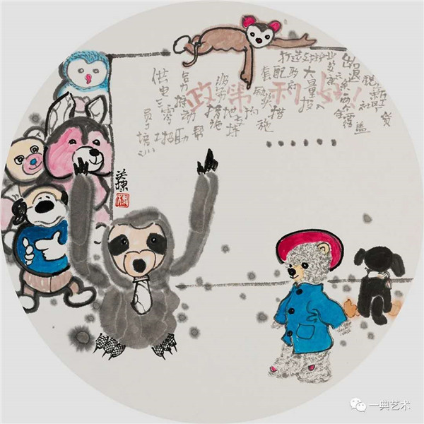 對于政策性的以及企業(yè)生產(chǎn)經(jīng)營活動,在這批作品中也有一定的表現(xiàn)。表現(xiàn)這種內(nèi)容是有難度的。創(chuàng)作中,我設(shè)定了毛絨玩具與政策的“互動”:譬如,我在一幅畫中,一群玩具的背影在觀看“安康六條”,而“安康六條”的縫隙,畫了許多活潑淘氣的玩具,透露出毛絨玩具產(chǎn)業(yè)的興旺發(fā)達(dá)。另一幅是一些毛絨玩具在好奇地觀看“看板”上的各種支持政策,一個調(diào)皮的猴子趴在看板頂頭給大家講解政策,擬人化、趣味性、含蓄、有情境,應(yīng)該解決了這類“難題”。